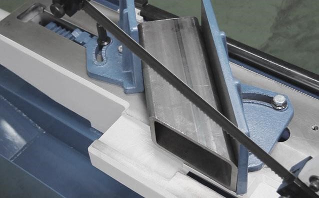 Конструктивное устройство станка, классическое для данного типа оборудования: в качестве базы используется массивная станина, а в качестве режущего модуля – пильная рама. Непосредственно процесс резки осуществляется пильным полотном (ленточная пила), которая сварена в кольцо и установлена на пильной раме, методом натяжения на шкивы. Пильная рама опускается под собственным весом, а регулируемый гидравлический цилиндр (гидроразгрузка), позволяет регулировать скорость опускания пильной рамы, в зависимости от установленной заготовки и режимов пиления.